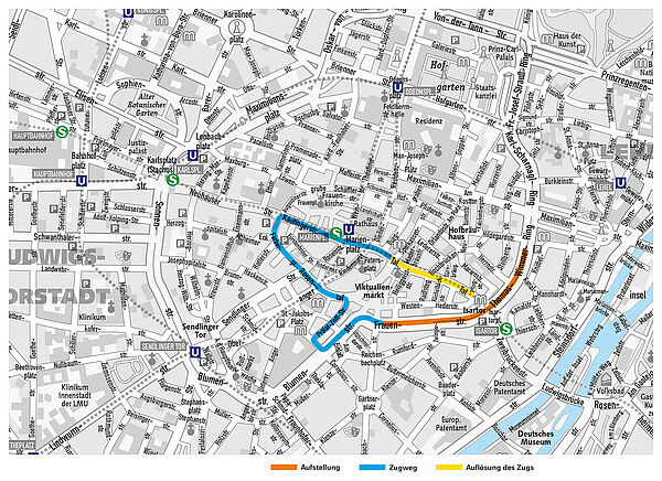 In bunten Wägen und mit viel Musik ziehen tausende Faschingsfans von 13:13 Uhr bis 16:00 Uhr durch die Münchner Innenstadt. Danach gibt es Bühnenprogramm auf dem Marienplatz.
