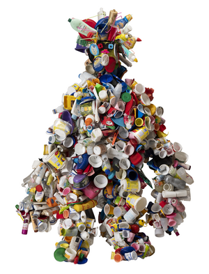 Komponiert aus Bechern und Kosmetika-Behältern prangert dieses Maskenkostüm die Verschmutzung der Welt durch Plastikmüll an. Geschaffen wurde es 2023 von der Künstlerin Sarah Ndele aus der DR Kongo und ist heute im Museum Fünf Kontinente zu sehen. Als Mitglied des Künstlerkollektivs Ndaku Ya bezieht sich Ndele damit auf die wichtige Rolle von Maskenritualen in vielen afrikanischen Gesellschaften bei der Bewältigung von Krisenzeiten.
