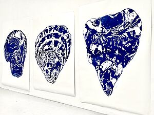 Rauminstallation mit großformatigen Holzschnitten und Skulpturen