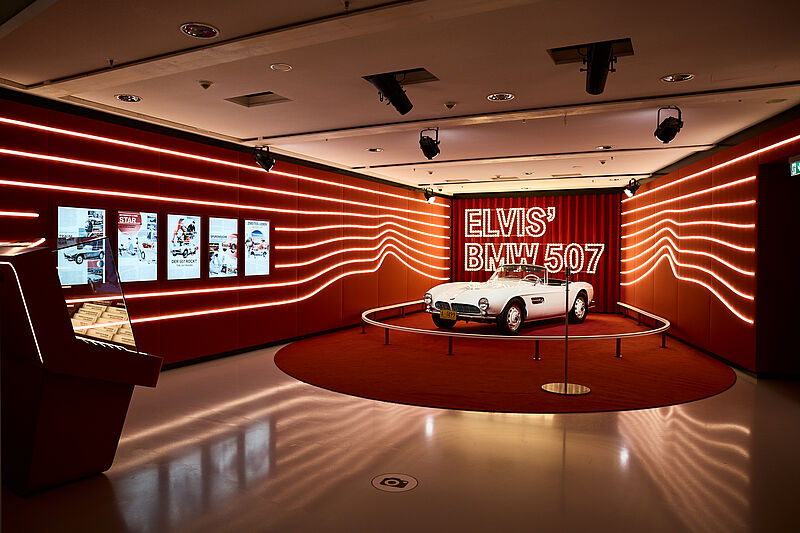 Ein besonderes Highlight ist der Raum, der dem ikonischen BMW 507 gewidmet ist, der einst dem King of Rock ’n’ Roll, Elvis Presley, gehörte. In einem authentischen 50er-Jahre-Ambiente kann dieses Meisterwerk der Automobilgeschichte bewundert werden.