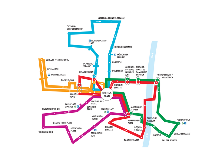 Linie ZENTRAL 90, Tour INNENSTADT 91, Tour WEST 92, Tour SCHWABING 93 und Tour OST 94 – Every 10 minutes, from 6 pm to 1 am, each venue will be linked up along one of the five MVG Shuttle Bus routes. Starting and end point for all these circular shuttle lines is the Odeonsplatz. You can hop on and off at any stop and change routes whenever you like. The first buses will leave between 5.45 and 6 pm, the last ones will finish their rounds by about 1 am.