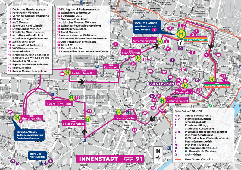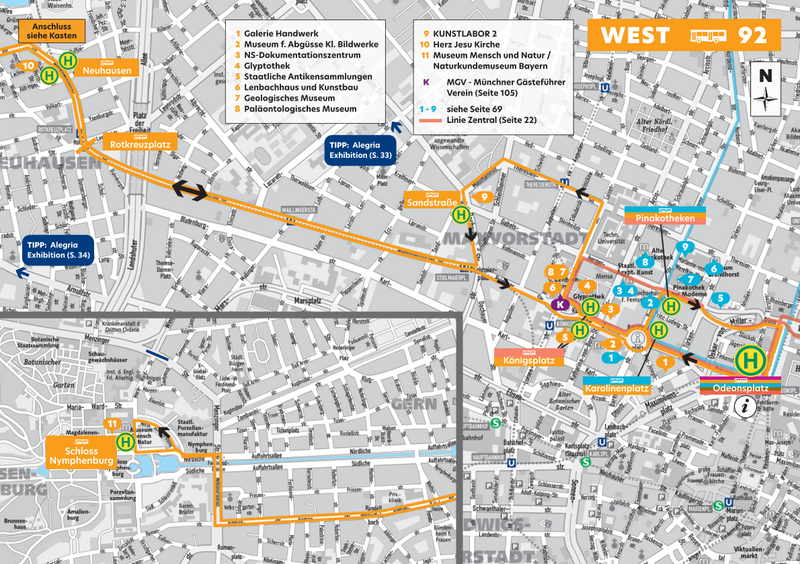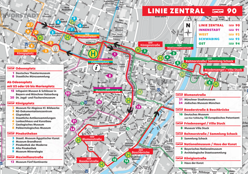 Linie ZENTRAL 90, Tour INNENSTADT 91, Tour WEST 92, Tour SCHWABING 93 und Tour OST 94 – Alle Ausstellungshäuser werden von 18 bis 1 Uhr von einer der fünf MVG-Shuttletouren im 10-Minuten-Takt angefahren. Start- und Endpunkt ist der Odeonsplatz. Sie können an jeder Haltestelle ein- und aussteigen und die Touren beliebig wechseln.