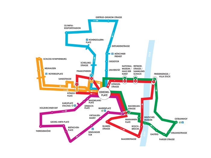 Linie ZENTRAL 90, Tour INNENSTADT 91, Tour WEST 92, Tour SCHWABING 93 und Tour OST 94 – Alle Ausstellungshäuser werden von 18 bis 1 Uhr von einer der fünf MVG-Shuttletouren im 10-Minuten-Takt angefahren. Start- und Endpunkt ist der Odeonsplatz. Sie können an jeder Haltestelle ein- und aussteigen und die Touren beliebig wechseln.