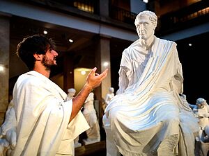 Das eigens zu diesem Anlass geschriebene Theaterstück feiert in der Langen Nacht Premiere. Menander, einer der großen antiken Dichter, darf für eine Nacht die Unterwelt verlassen − und landet unversehens im Museum für Abgüsse, wo er die Gipse zum Leben erweckt.
