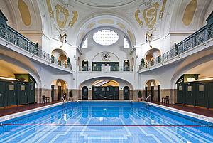Ab 22.00: Das Volksbad ist das Jugendstil-Juwel der Münchner Bäder und eines der schönsten Badehäuser Europas. Bei der Langen Nacht der Musik wird das Bad zum Chorraum. Von 22.00 bis 1.00 Uhr singen Chöre im halbstündigen Wechsel in einer der beiden Schwimmhallen.